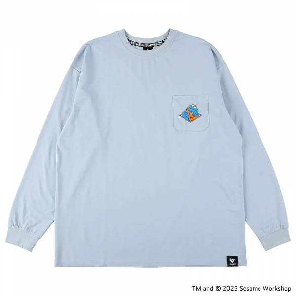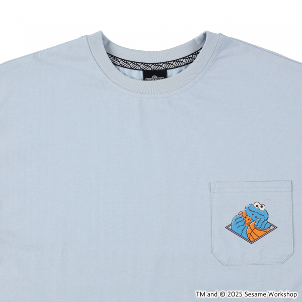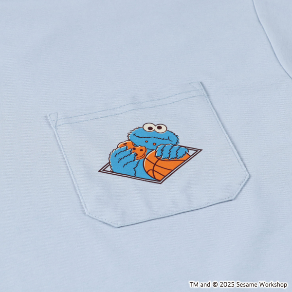 フロントの胸ポケットには、バスケットボールとくつろぐクッキーモンスターをプリントで配置し、遊び心たっぷりの仕上がりに。