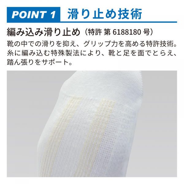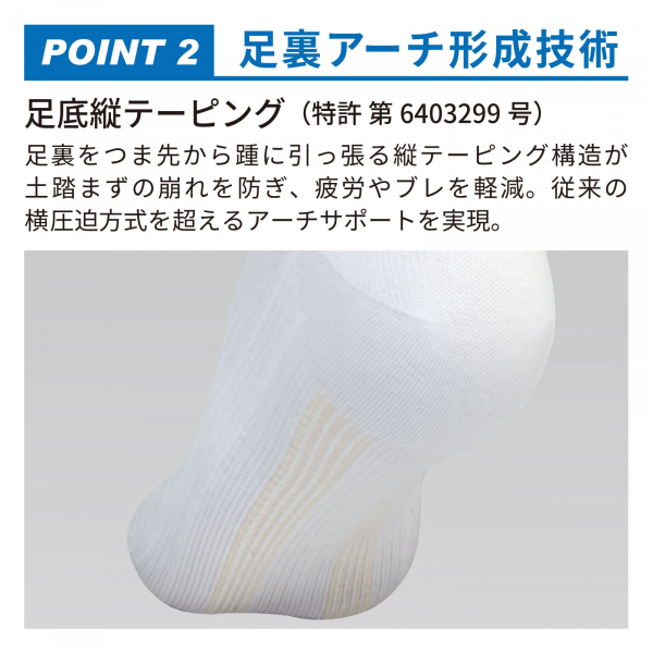 靴の中でのズレを防ぐ「編み込み滑り止め技術」と、足裏のアーチを支える「足底縦テーピング構造」。
