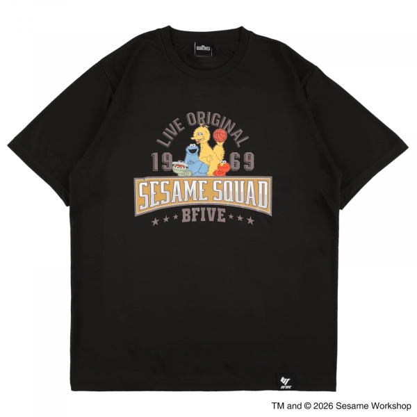 クラシックなカレッジ風デザインに、バスケを楽しむセサミストリートの仲間たちが映える一枚。