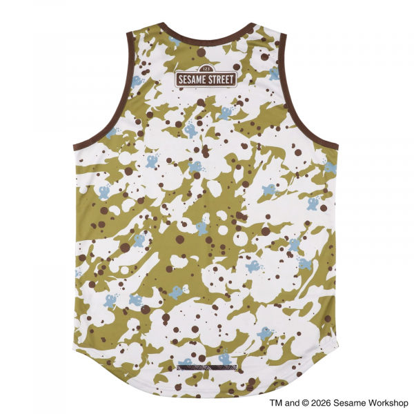カモフラ柄にセサミストリートの仲間たちをちりばめた、ミリタリーテイストの総柄タンクトップ。