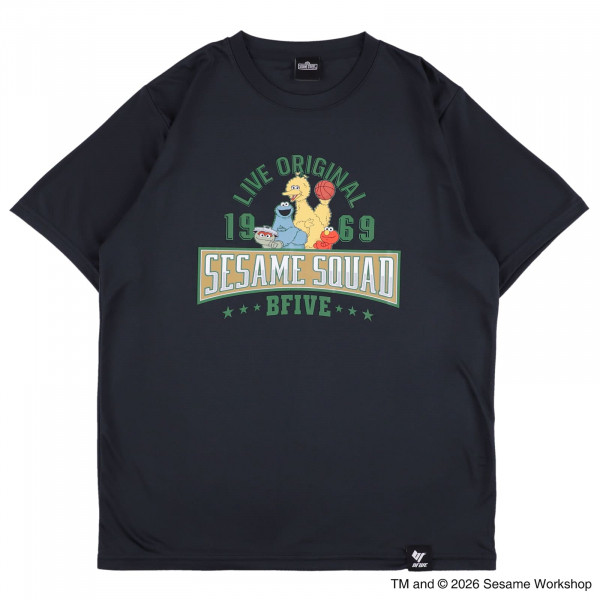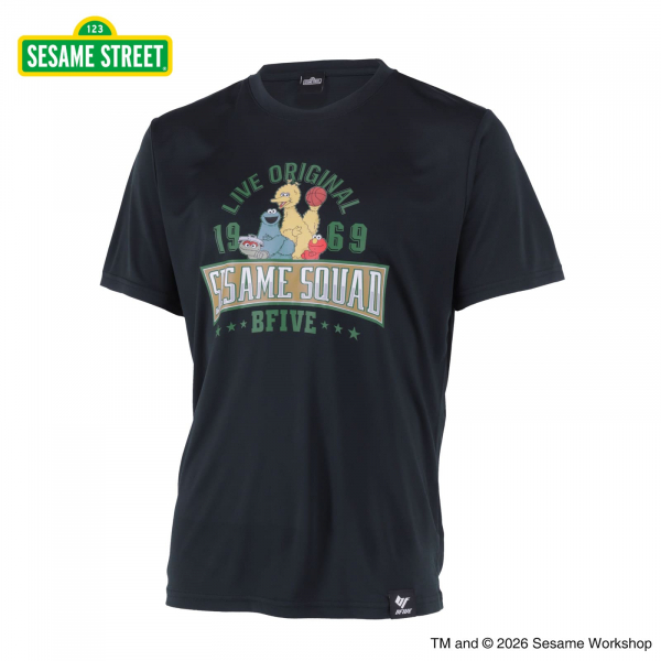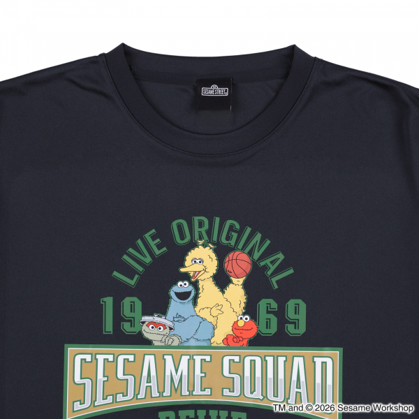 クラシックなカレッジ風デザインに、バスケを楽しむセサミストリートの仲間たちが映える一枚。