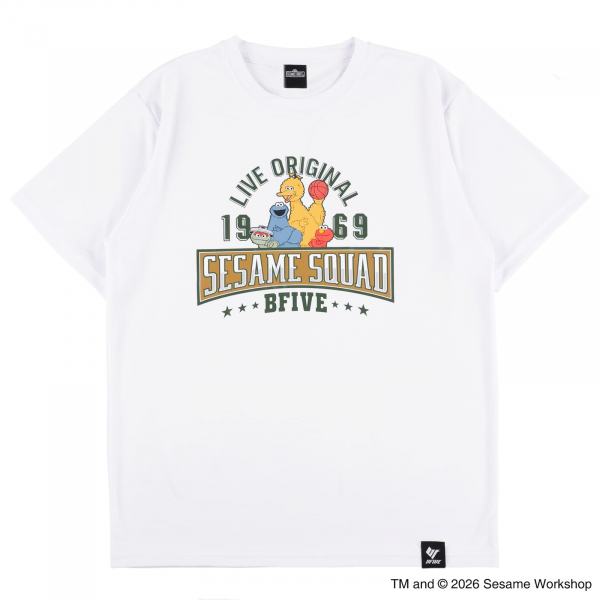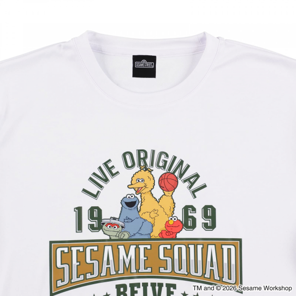 クラシックなカレッジ風デザインに、バスケを楽しむセサミストリートの仲間たちが映える一枚。