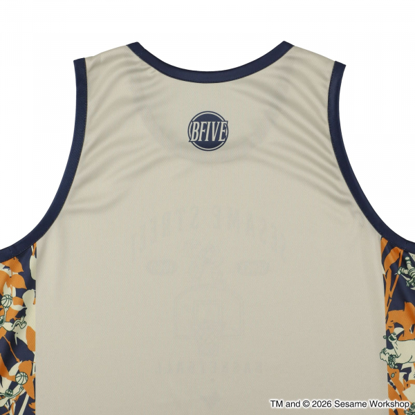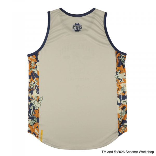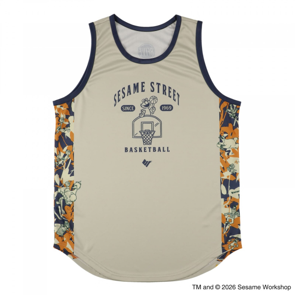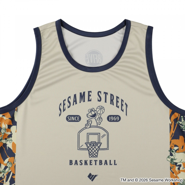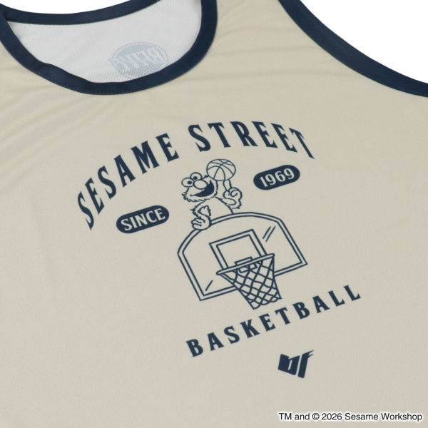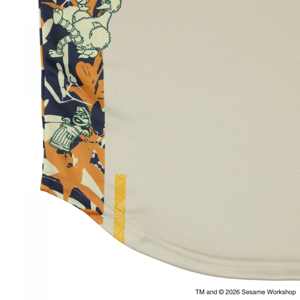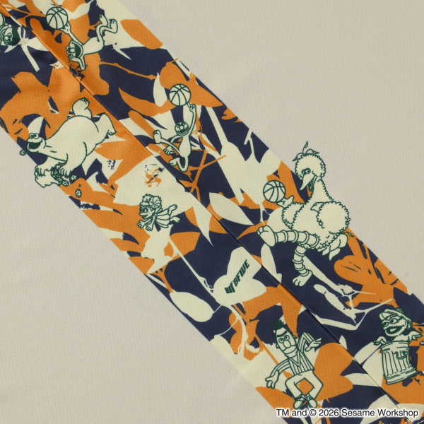 サイドラインにセサミストリートの仲間たちがずらりと並ぶ、遊び心あふれる一枚。